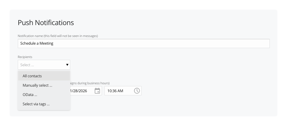 Choose who receives your push notification. Use the Recipients dropdown to select one or multiple recipients from anyone who has opted in to push notifications.